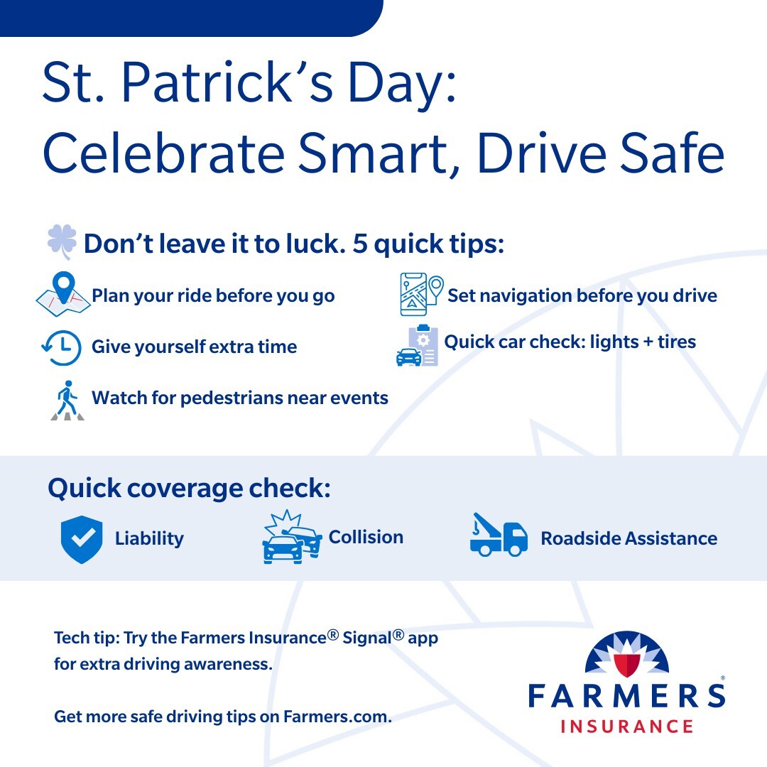 Heading out to celebrate St. Patrick's Day? Farmers Insurance® shares simple tips to help drivers plan ahead.